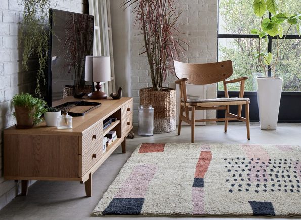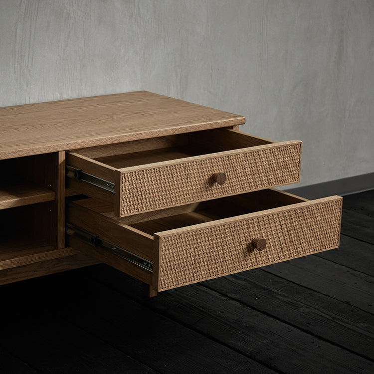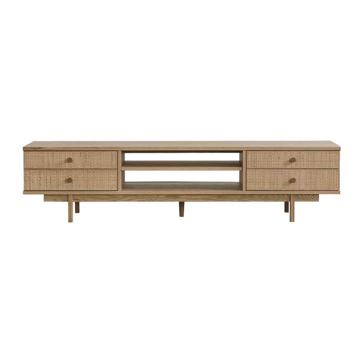 オーク材の重厚感ある質感に、ラタンの質感を重ねたテレビボード。たっぷりとした大きさがありながら、シンプルでお部屋に馴染みやすいようにデザインされています。
