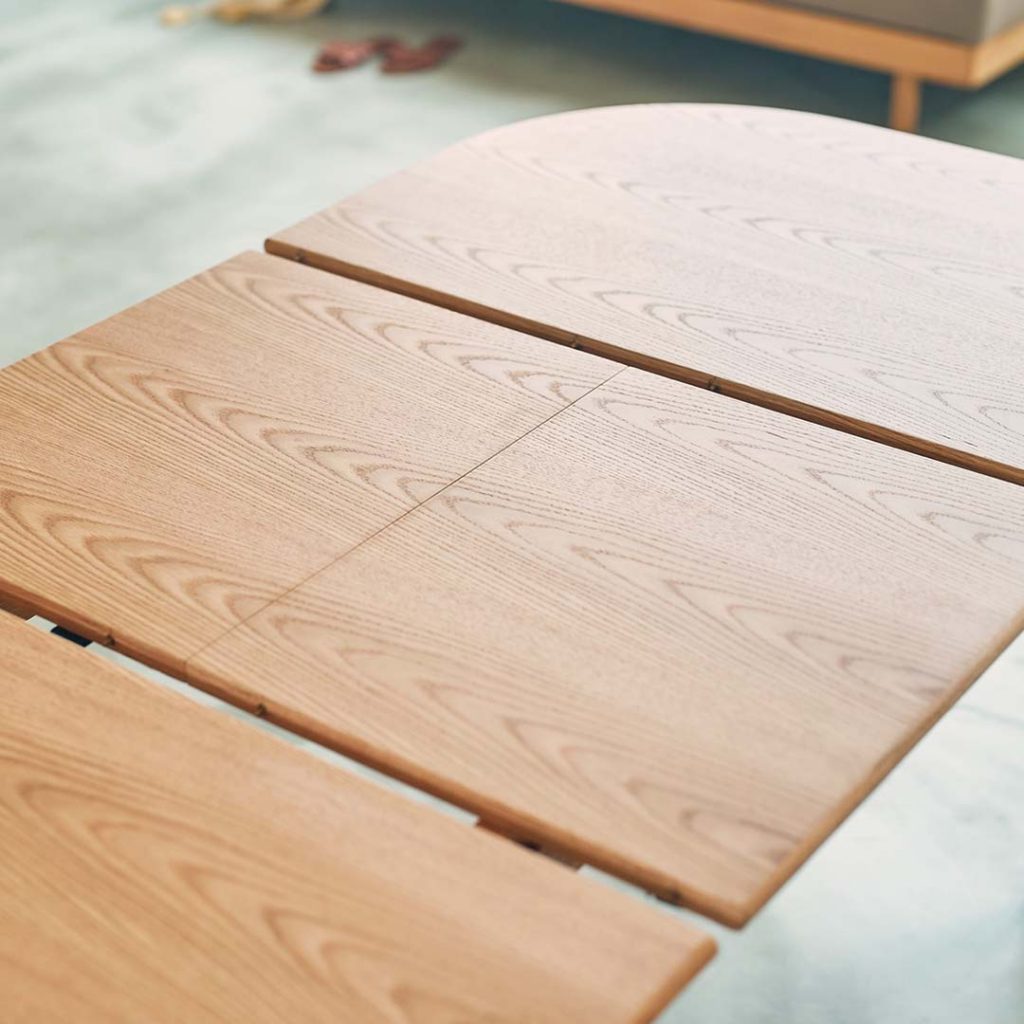 伸長天板は天板裏に収納でき、使わないときも置き場所に困りません。曲線を描くラウンド型の天板は、縁まで丸く仕上げられており、滑らかな手触りも魅力です。