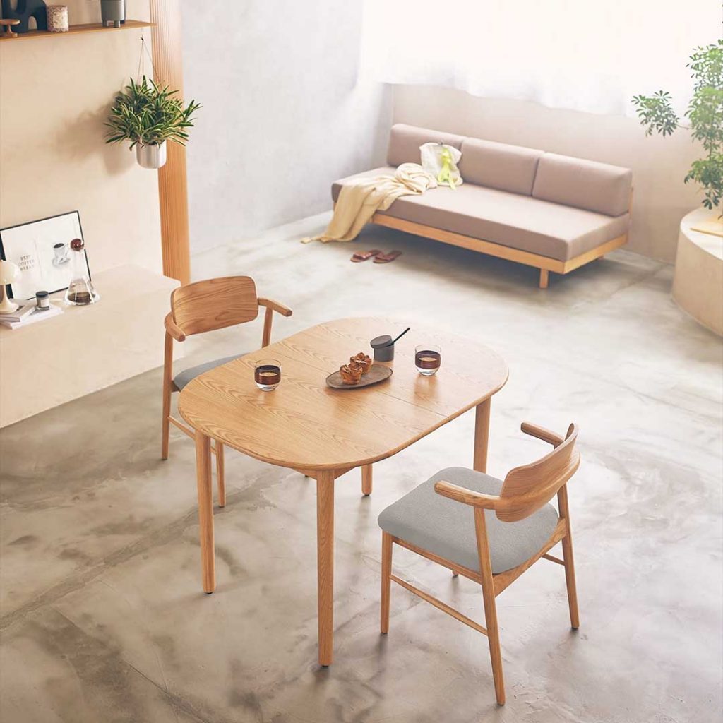 丸みを帯びたフォルムがやさしい印象を与える伸長式ダイニングテーブル。天板は幅110cmと160cmの2段階に調節でき、2〜4人での使用に対応します。