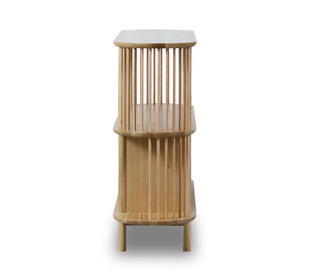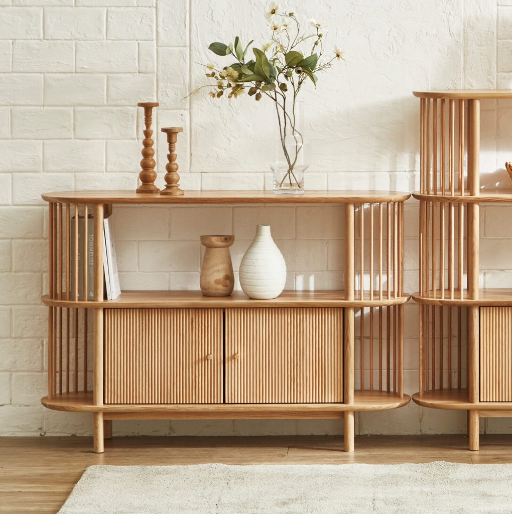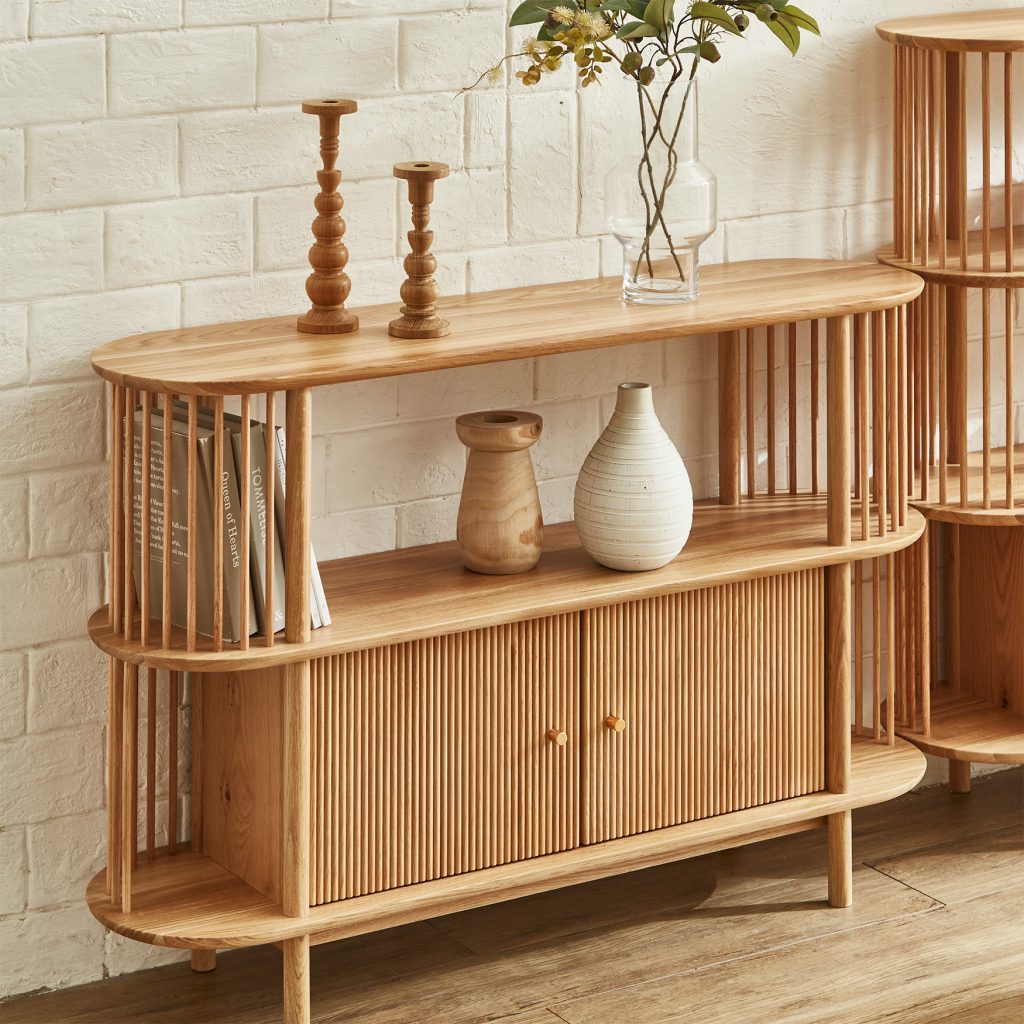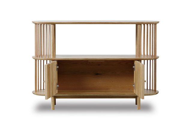 無垢材を贅沢に使用した棚板やスポークが魅力のシェルフ。落ち着いた雰囲気に華やかさを添える佇まいが印象的です。お気に入りの小物や観葉植物を飾れるオープン棚に加え、扉付き収納も備えており、日用品や書類を整理できます。