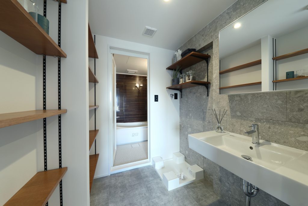 壁面に備え付けの棚を設置することで、新しい家具を購入する必要もありません。脱衣所、洗面スペースを広く使うことができます!